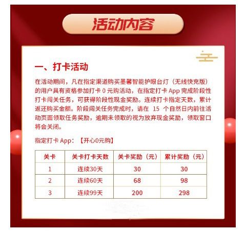 用户每日打卡任务为:墨馨智能台灯联网状态下通过App控制台灯打开和关闭一次。