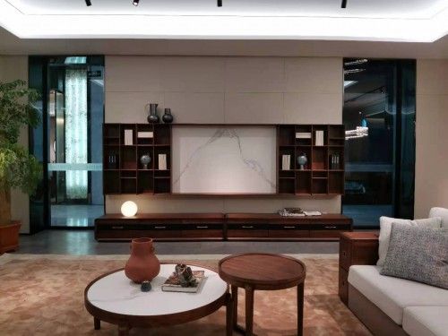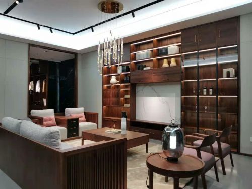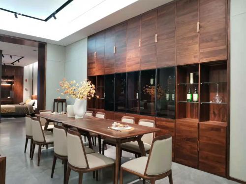 黑胡桃的材质天然呈现出大山纹理、水波纹理,非常时尚并且符合当代主流消费群体的青睐。同时在优质原材料的基础上提升软体舒适度,例如将沙发靠背海绵改为羽绒,不仅特别松软,而且恢复快;再配以时尚材料,例如皮、大理石材、铜等,使得家具整体带来既轻奢又时尚的人文感受。