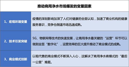不难看出,商用净水市场的爆发也许将更早到来。商用饮水停留在桶装水阶段已久,主要在于“替代品”的运营模式和销售模式并没有重大突破,单一产品力领先不足以形成成熟的商业模式,不足以引发行业的变革。而当前物联网、以租代售等针对性解决方案的不断成熟,让整个商用净水行业发生了明显改变,这些改变主要基于以下三个方面: