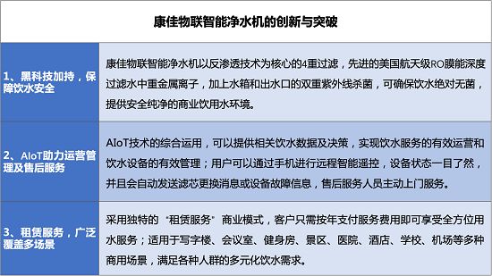 除了技术层面的创新,康佳物联智能净水机还以更为彻底的“以租代售”商业模式,大幅降低商用净水机的购置成本,减少了财务报表中固定资产和折旧的占比,同时通过经营性现金流实现商业场景的“即采购即获益”……由此可见,基于物联网技术,康净实现了商业模式的全面重构。