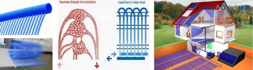 相比之下,“毛细管网+集中新风”的形式可以很好地解决了以上问题。毛细辐射系统的设计理念是基于人体仿生学,将充满流动液体的柔性毛细管网安装在房间围护结构内部,可以柔和地改变墙体、地板、顶棚等区域的温度,使室内温度较为均匀,不会出现较大的温度梯度。简单来说,就是不依靠风进行冷热交换,而是通过顶面、墙面、地面铺设的毛细管网向室内辐射冷热量。