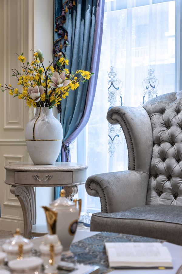 而客厅的设计和家具的选择,则采用现代轻奢与美式复古优雅的格调,致力描摹出一个时尚、大气、优雅的居家艺术图景,使其在新与旧间形成对比。