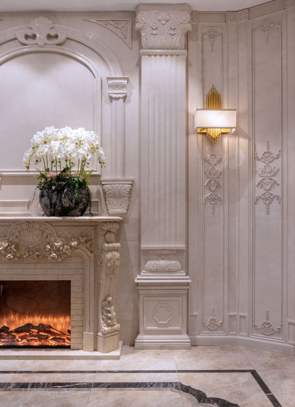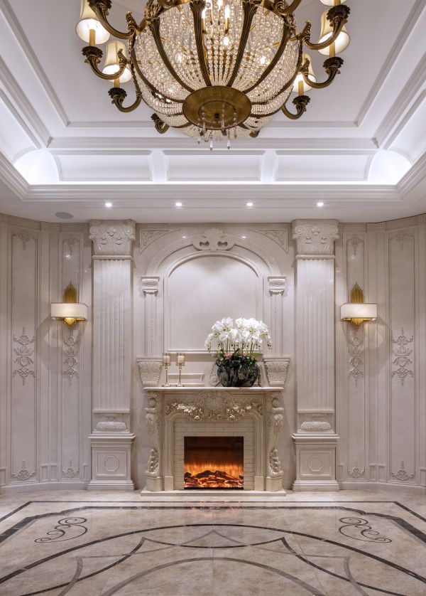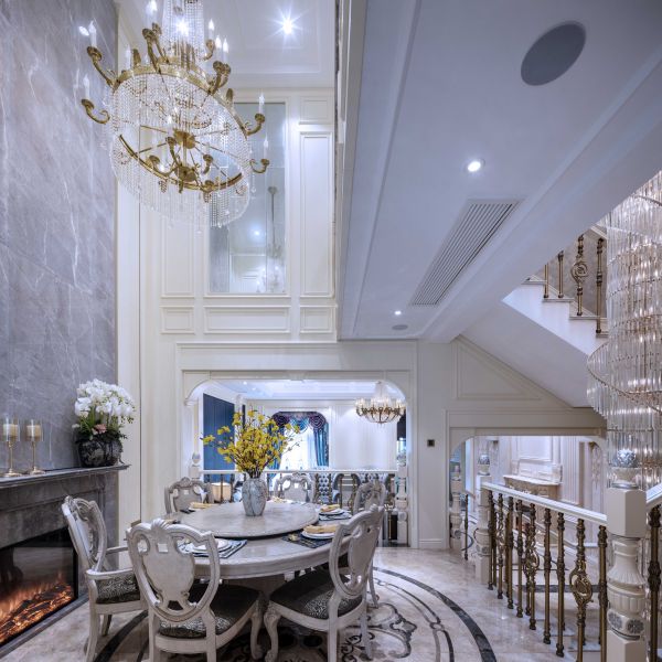 餐厅处嵌入壁炉和烛台元素,在良好的采光和配色映衬下,更添一份轻盈感与高级感。