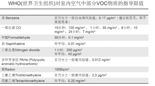 TVOC超标严重影响室内空气品质,世界卫生组织(WHO)、美国国家研究理事会(NAS/NRC) 等机构一直强调TVOC是一类重要的空气污染物。世界卫生组织(WHO)更是对VOC物质提出了指导限值,可见TVOC在家装安全中的重要性。