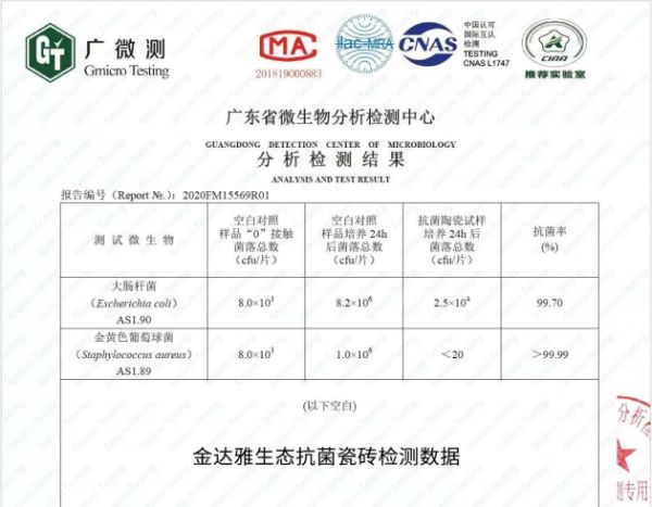 金达雅陶瓷与东鹏在健康瓷砖研发推广上属于并驾齐驱的两大国内一线品牌。针对在人们生活周围大量的细菌构成对人体健康威胁的问题,金达雅依托总公司天欣集团(中国民营企业500强)雄厚的企业实力,斥巨资组建专家团队潜心研究,数十位国内外知名技术专家经过18年技术研发,1200次配方调试,终于成功研发国内领先的生态抗菌瓷砖,金达雅生态抗菌瓷砖将金属抑菌科技融入瓷砖之中,破坏细菌蛋白分子结构,使细菌丧失繁殖能力而死亡,实现全天候杀菌,构建起健康环境防护网,为家人的健康保驾护航。经过广东省微生物分析检测中心检测(报告编号为:2020FM15569R01),金达雅生态抗菌瓷砖能有效抑制与杀灭大肠杆菌与金黄色葡萄球菌,在检测实验条件下,对大肠杆菌的抗菌性能达到99.7%,对金黄色葡萄球菌的抗菌性能达到99.99%,能长久守护家人健康。