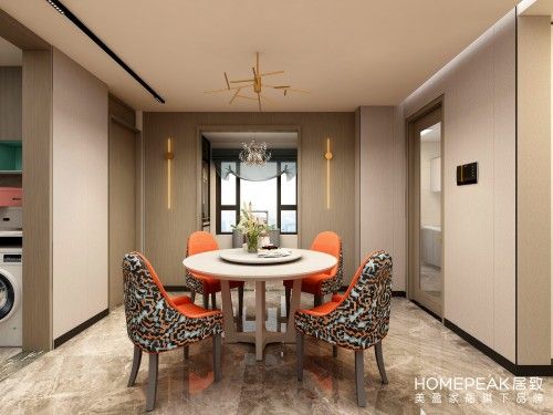 动物纹装饰的家具往往能为空间带来野性的活力和动感。对于餐厅来说,爱马仕橙与虎纹的搭配,映衬出餐厅空间格外富有生机。现代简约风格设计的圆形转盘餐桌,以灵活变换的姿态,成全一日三餐的陪伴与幸福。