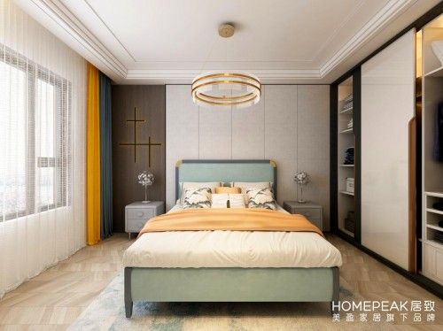 主卧室选择青竹色的床具与暖黄色的床品相搭,让卧室空间始终保持轻松爽朗的氛围。如此曼妙的颜色组合让人一眼就回到夏天,仿佛有种看到蔚蓝大海和金色沙滩的惬意。精致小巧的床头柜设计,诠释着现代简约风格的奥义。高级灰的色调,带来舒适而平静的视觉享受。