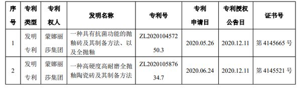 新浪家居讯 艾蕊 蒙娜丽莎(002918)1月9号发布公告称,公司于近日取得国 家知识产权局颁发的发明专利证书 2 项,具体情况如下: