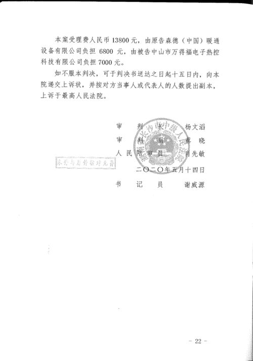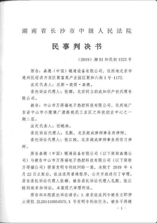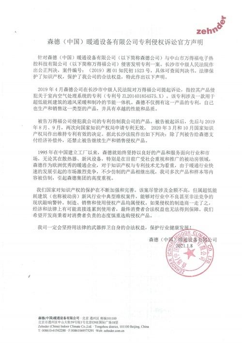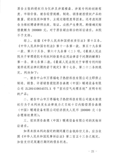 值得庆幸的是,已经有企业在捍卫的道路上迈出了长足的一步,更是给暖通行业树立了维权的样板。据悉,有关森德(中国)暖通设备有限公司向中山市万得福电子热控科技有限公司,提出的关于发明专利权纠纷一案最终判决水落石出。森德公司最终胜诉,被告方万得福需立即停止制造、销售、许诺销售侵犯森德公司相关“室内空气处理系统“发明专利的产品,并赔偿原告森德公司经济损失。