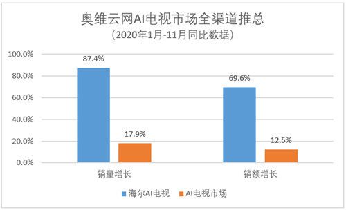 值得注意的是,在整体行业不景气的情况下,海尔电视的表现却出乎意料。2020年1月-11月,海尔电视销量和销额分别增长23.2%和18.5%。同时,海尔AI电视的销量与销售额也分别达到87.4%、69.6%,分别是行业的4.8倍和5.5倍。