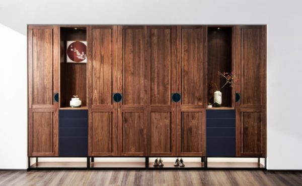 推开那扇门,步入“前有嚣喧朝市,后有冷落丘樊;城南有秋山,城东有春园。”的中隐。身前“恣欢言”“吉且安”,身后“苦冻馁”“多忧患”,封闭式收纳柜和原木纹理的门仿若那双温暖又温柔的手接过你披拂的风与尘。实木门板门框采用25mm北美赤桦木指接板贴黑胡桃木皮实木边框,芯板采用进口全松板,表面贴黑胡桃木皮,或正面外贴4mm仿岩板玻璃尽显古朴大气;门板厚度超过大多数国内品牌的18/20/22 厚,使得门板品质可靠,性能更稳定;上下拼门工艺,即使是超长高柜门板,变形风险也大大降低。门板搭配两款寓意圆满的金属装饰,打破传统定制门板单一呆板的印象,细节考究,尽显意会东方的设计内涵。隐藏式拉手设计,内嵌中国文化元素图案的金属装饰片,与门板设计浑然一体,圆弧纹样哑光靛蓝色玻璃寓意“圆满”,方形水纹金属饰片寓意“财源滚滚,顺风顺水”,天圆地方,不彰自显。
