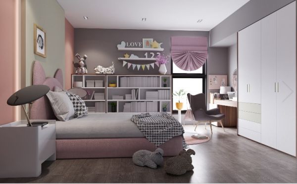 一个小小的房间,就是一个成长的世界。用双色烤漆衣柜搭配可爱的粉色调,给孩子温暖的四季呵护。半墙高的模块式书柜对成长中的孩子更友好,搭配胡桃木书桌台营造舒适的学习环境。