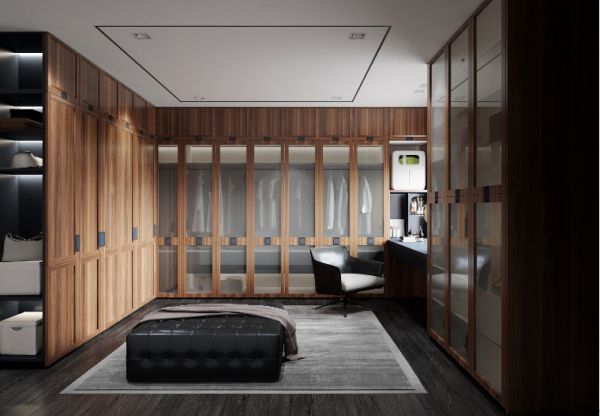 与书房的严谨不同,独立衣帽间里藏着的是你的盔甲。加高收纳柜装满四季的回忆,胡桃木玻璃门衣柜安放不同场合的盛装,有藏也有露。首饰区空间充足,收纳柜藏着珍爱的首饰,而挂式区可随时放置日常“装备”,带有化妆品冰箱的组合式烤漆梳妆台,再多化妆品也能轻松容下。