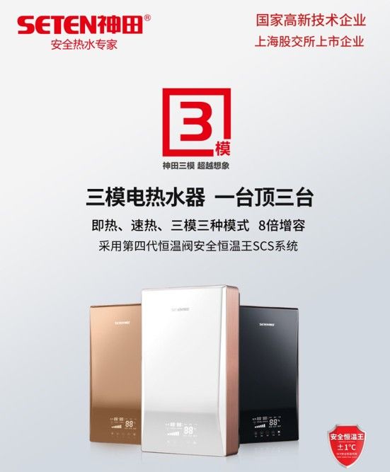 作为速热式行业的领导品牌,神田三模速热在速热式行业树立了技术领先的优势之后,安全恒温王SCS系统的应用,组合成为了行业的“王炸”,在技术优势、安全性能上都遥遥领先,倍受同行关注,神田也是这两年行业内发展快速的品牌之一。