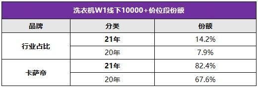 2020年W1数据显示,万元以上洗衣机行业占比为7.9%,卡萨帝洗衣机占比为67.6%。而在2021年刚开始,这一优势又有了迅猛提升。中怡康刚刚发布的2021年W1最新数据显示,万元以上价位段行业整体份额为14.2%,其中卡萨帝份额达到82.4%,高端第一地位不言而喻。
