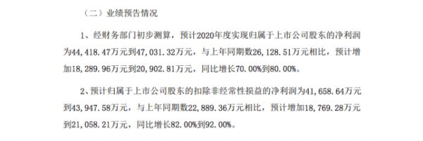 1月12日,江山欧派发布2020年年度业绩预增预告称,公司预计2020年度实现归属于上市公司股东的净利润为4.4亿元到4.7亿元,比上年同期增加1.8亿元到2.1亿元,同比增长 70.00%到80.00%。预计归属于上市公司股东的扣除非经常性损益的净利润为4.1亿元到4.4亿元,比上年同期增加1.9亿元到2.1亿元,同比增长 82.00%到92.00%。