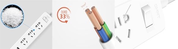 排插导线采用高精铜导线,线径足、能耗小、能承载更大电流,大功率电器使用,安全性能更高,有效预防由于用电负荷过大造成的电线发热甚至火灾事故。