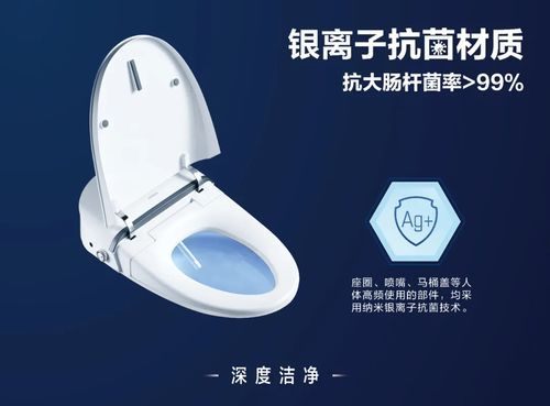 2、银离子抗菌材质银离子抗菌材质则是“超洁净”系列智能马桶的又一抑菌“利器”。马桶的坐圈、喷枪喷头、马桶盖等人体高频使用的部件,均采用纳米银离子抗菌技术,游离的银离子能直接进入细菌内部,使其失活致死,抗大肠杆菌率>99%,具有持续高效的抗菌效果。