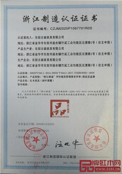 获评“浙江制造品字标”认证,标志着古森红木成功跨入“浙江制造”高尖品牌行列