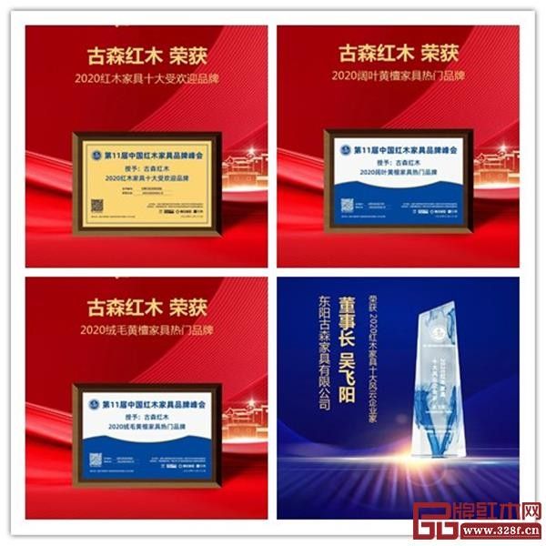 从新品牌推出,到入选百度家具品牌榜,与众多优秀品牌比肩;从首次荣获“东阳市木雕红木家具骨干企业”到闪耀浙江·乌镇互联网国际会展中心,一举包揽“2020红木家具十大受欢迎品牌”、“2020阔叶黄檀家具热门品牌”、“2020绒毛黄檀家具热门品牌”及“2020红木家具十大风云企业家”四项大奖,古森红木不鸣则已一鸣惊人,品牌势能在2020年达到新高度。