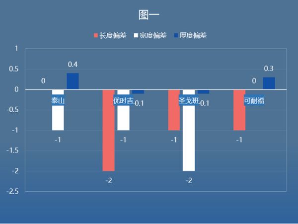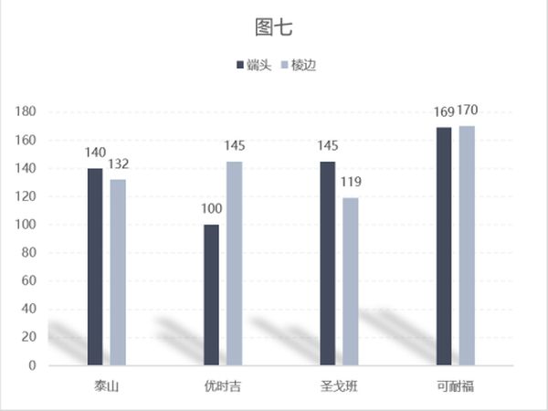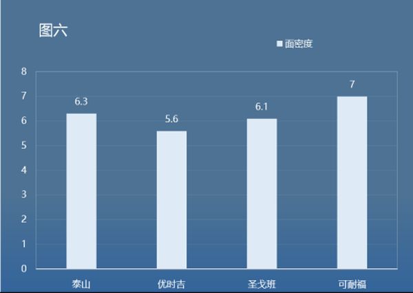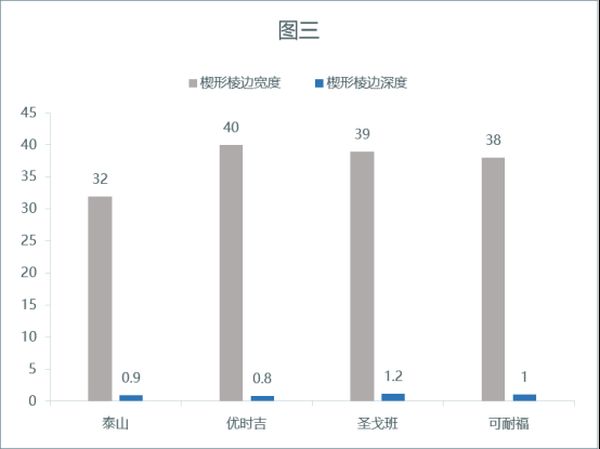 本次楔形棱边宽度与深度的数据中,优时吉楔形棱边宽度较高达到了40mm,泰山最低为32mm。4家企业的产品在楔形棱边深度的数据上均有差距,优时吉、圣戈班、可耐福3家外资企业数值从0.8mm-1.2mm不等。泰山的楔形棱边深度为0.9mm,在4个品牌中数值居中。