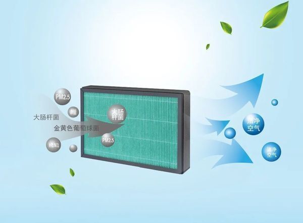 我们采用的HEPA滤网即高效过滤器,它要求对PM0.3(直径约为0.3微米的颗粒物)不低于99.97%的过滤效率,但0.3微米不是它的极限,0.3微米只是最难被过滤掉的颗粒大小,实际上0.1微米也不在话下。安装了HEPA滤网的新风系统可以有效过滤阻隔PM2.5、细菌及病毒,PM2.5的净化率高达99%,同时对细菌(大肠杆菌、黄金葡萄菌)及病毒(H1N1)的灭活率达到99.99%,能最大程度阻断病毒进入室内。