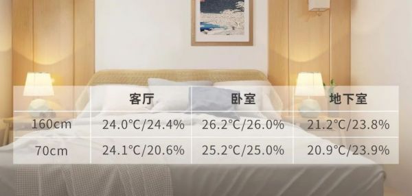 本次测试,工作人员选择客厅、卧室以及不太使用的地下室进行了不同高度(70-160cm)的温度测试。结果显示,业主家中空间的温度分布比较均衡,在距离地面160cm处,客厅、卧室、地下室的温度、湿度分别为:24.0℃/24.4%、26.2℃/26.0%、21.2℃/23.8%。与之前70cm处的温湿度相比,同一室内垂直距离90cm的温度变化最大仅为1℃,湿度变化仅为3.8%,表现非常稳定。其中,在业主活动频率较高的客厅,垂直距离温度变化仅为0.1℃,几乎可以忽略不计。