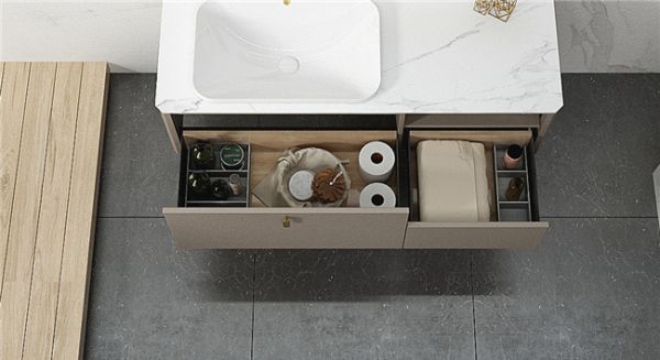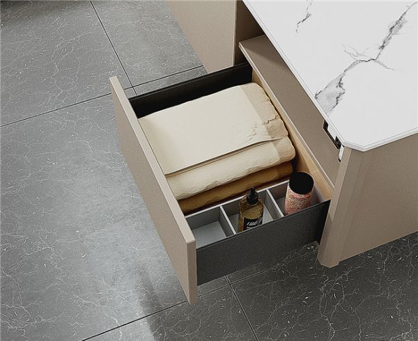 主柜抽屉采用Unihopper超薄抽,可选配的收纳盒,给使用者一个收纳分类的概念,自然地引导收纳,分类一目了然,让生活更加高效,精致不止在表面,更在内里。