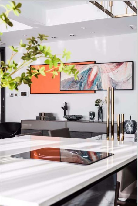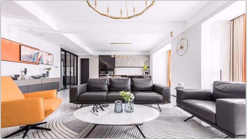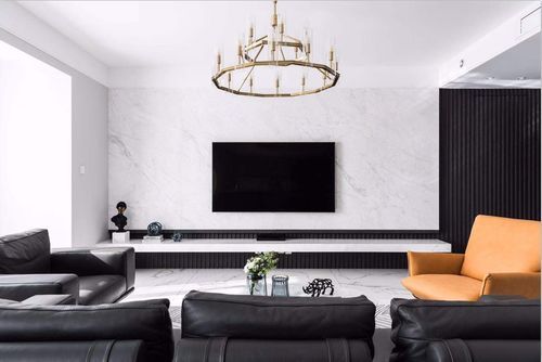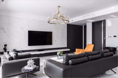 整个家居设计以极简的表现形式,来满足人们对于简约却不简单的居室环境的要求。除了常规的黑白灰外,客厅还用了爱马仕橙作为色彩点缀,让整个空间看起来更加明亮点。