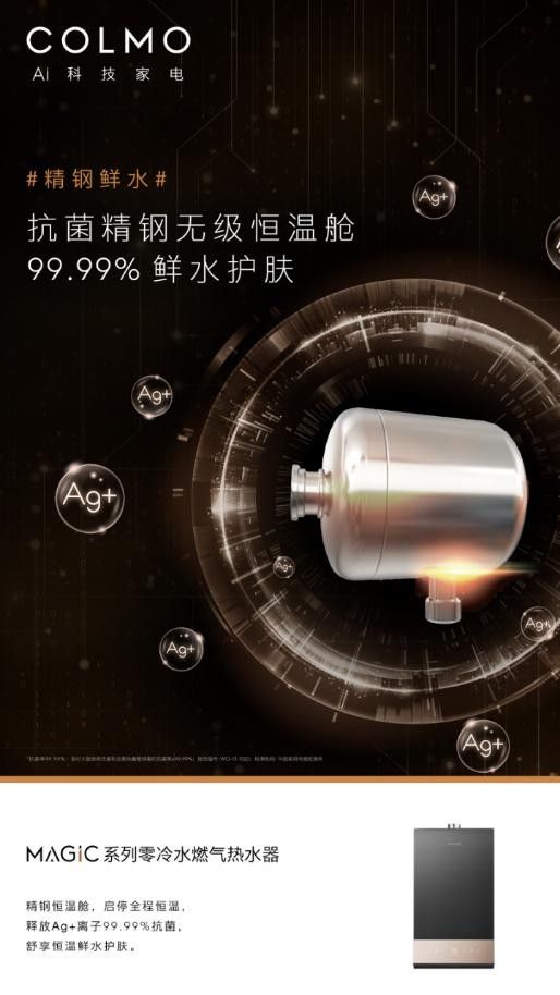 COLMO MAGIC系列零冷水热水器,采用无级恒温舱采用抗菌精钢材质,舱内中和冷热水,维持水温持久恒定,告别忽冷忽热;其中添加的Ag+银离子,皆采购自日本石塚硝子株式会社,抑菌率高达99.99%,确保每一滴水纯净鲜活,随时随地安心享受。