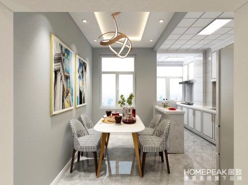 餐厅沿用着客厅的时尚风格。布艺餐椅采用简单大气的造型,流畅的线条,展现干净利落的现代主义风格。经典千鸟格元素是点睛之笔,将空间的时尚与清新感完美呈现。强质感的大理石饰面搭配金铜色的纤细支架,就像芭蕾舞者一样翩翩起步,时尚典雅。