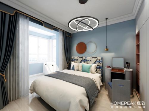 床是卧室的灵魂,而关于床的装饰也不仅仅停留在床品的设计上,床头板的设计变得更为重要。它不仅起到美观装饰的作用,也起到确定空间风格和主人品位的作用。这个卧室空间,主人想表达清新时尚的家居效果。随意点缀的不规则图形床头板,带来超现实的艺术魅力,为空间带入一份个性与新潮。卧室内搭配一款创意时尚独立式梳妆台,小巧的外形设计,方便移动且不占过多空间。时尚创意的造型设计,为卧室空间打造出一个实用而充满个人风格的角落。精致的一天,从这里开启。
