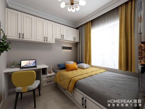 现代简约风格,追求“少即是多”的设计理念,尤其是在小卧室里。选择一款具有收纳功能的榻榻米,在充分利用空间的同时,还能节省活动空间。空间小,也不能放弃对精致生活的追求。在墙壁上设置具有简单轻巧结构的桌面及储物柜,视觉上使空间更整洁,空间的收纳能力也有所提高。卧室里少不了一张舒适的椅子。菱形的简约之美,运用于椅子中,带来一种别样的艺术品质与高级感。柠檬黄色的靠背设计,与床品相互呼应,带来灿烂而温暖的空间氛围。