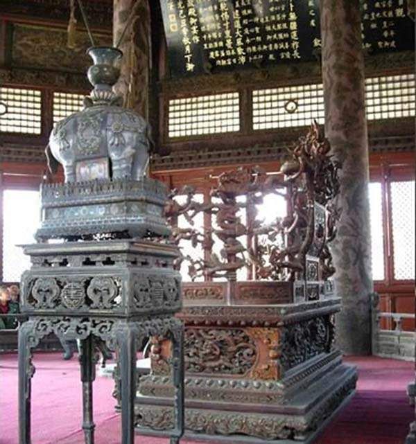 宝座被七级台阶高高托起,香筒、香炉、瑞兽围绕。仙鹤,保佑皇帝健康长寿;宝象,象征着国家安定稳固;宝瓶中盛着五谷;大象,驮宝瓶而来,带来了丰收和吉祥,寓意:太平有象。甪端,带来广博知识,显示皇帝身在宝座,通晓天下。屏风,周代诞生时专设在宝座背后,以示天子权威。