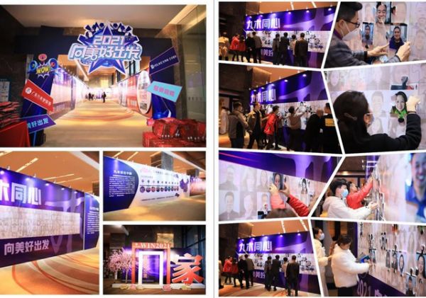 入场前,参加年会的家人们拿着笑脸拼图,一个个把笑脸拼在会场左侧的笑脸墙上,130个笑脸组成一幅画,仿佛在家人们说:欢迎回家。