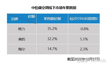 中怡康数据显示,2020年1-52周,海尔智家空调线下零售额年累份额达14.7%,较2019年同期增长2.3%;线上零售额年累份额较2019年同期增长2.4%,这也是2020年在疫情与价格战的双重磨砺下,唯一实现双增长的空调品牌。