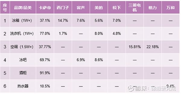 空调方面,卡萨帝在1.5万元以上价位段份额37.77%,整体份额3.2%跻身前五;在冰吧、酒柜市场,卡萨帝继续以数倍于第二品牌的优势领跑,份额分别为69.7%、91.9%。