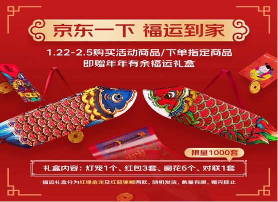年货节期间,京东推出头号京贴,每满300减40和每满1000减60两档优惠,覆盖时尚居家服饰、鞋靴、箱包、内衣、童装、钟表、珠宝、美妆、居家等全品类,多买多实惠。1月22日至2月5日,购买指定活动商品还送年年有余福运礼盒,礼盒外部摇身一变就是锦鲤灯笼,预祝大家在新的一年“年年有余”。