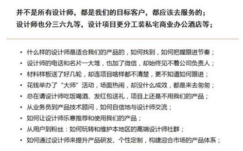 5年前,对设计师渠道1%认知差别,在今天,产生的业绩差异可能超过100倍。精准项目、长期资源、圈层传播、相对牢固和持续的供销关系,这些都是设计师渠道所拥有的绝对优势。得设计师渠道者,得未来市场销量入口。疫情之年,之前在设计师渠道打下了基础的建材家居产品厂家,普遍受影响较小,甚至还在增长。