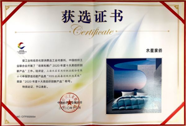 为贯彻落实《国务院办公厅关于开展消费品工业“三品”专项行动营造良好市场环境的若干意见》(国办发〔2016〕40号)精神,推动企业加快实施“三品战略”,倡导以市场需求为导向的产品创新与创意设计,发挥创新产品的示范引领作用,提高创新产品的品质满意度和品牌信任度,受工业和信息化部消费品工业司委托,中国纺织工业联合会开展了培育和推广2020年度十大类纺织创新产品工作。经由中纺联生产力促进部审查、消费者投票和专家评定后,评选出“时尚创意产品”、“非遗创新产品”、“智能科技产品”、“舒适功能产品”等十大类纺织创新产品。其中,水星家纺凭借“N99羽绒水洗夏被”荣获“2020年度十大类纺织创新产品”荣誉称号。