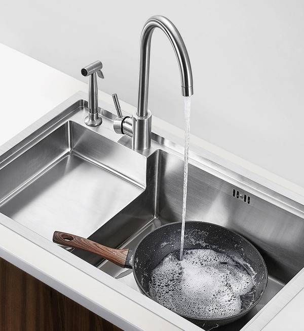 虽说有了分区,但这款水槽依旧是一个整体,洗大型工具一点问题也没有。这里拿比较有代表性的炒锅举例,一般的双槽因为带有隔板,所以导致锅被卡住放不进去。而阶梯式水槽的大槽区域可以容纳锅的主体,小台面区域则容纳炒锅手柄,大型工具清洗无忧。