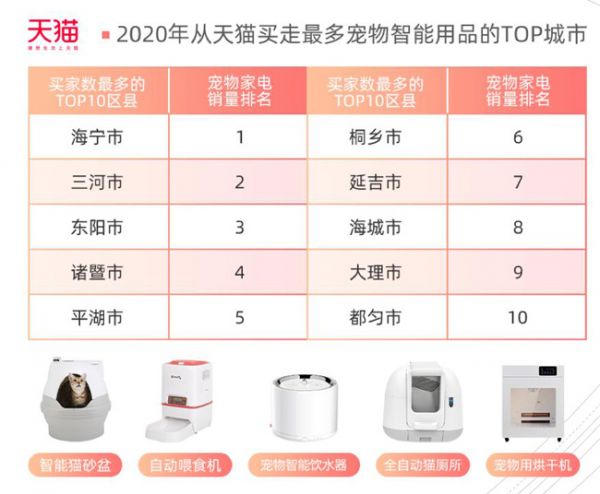 张薇介绍称,猫砂盆成了2020年唯一跻身智能家居消费增速TOP10的宠物用品,在下沉市场中销量同比增速超200%。在天猫平台搜索“宠物、智能”等关键词,智能猫砂盆、自动喂食器、宠物饮水机成为养宠人士最常“孝敬”主子的智能三大件。其中,下沉市场消费者人均花费1084元来购买智能宠物用品,“猫妈”比“猫爸”更舍得花钱,女性消费者数量接近男性消费者的2倍。