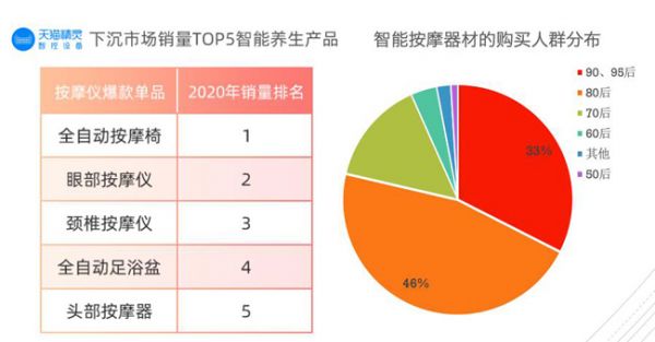 除了健身,养生也是小城青年关心的正经事。天猫数据显示,可语音控制的取暖桌、电热毯,在下沉市场的年销量增速至少翻了2倍,其中近8成智能按摩产品被80、90后买走。全自动按摩椅、眼部按摩仪、颈椎按摩仪,成了小城青年的“心头好”!