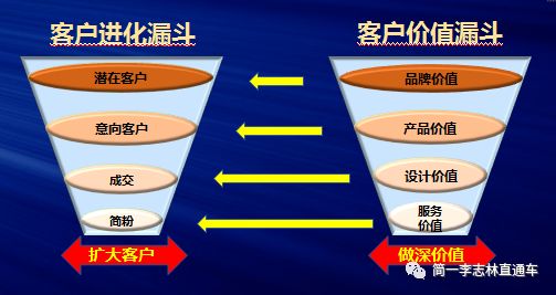 左边是客户进化漏斗,从潜在客户进店,到愿意真正跟你谈方案的意向客户,再到确认方案成交的客户是越来越少,真正的简粉,可能1%都不到,为什么漏斗锥心这么尖,一定是有东西没有做到位。