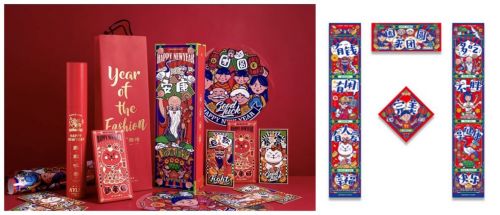 妙手回潮的阖家团圆礼盒,包含了春联、红包、窗花等年品,设计融合了现代插画和漫画的形式,每个格子每个分镜都是按照漫画形式来排列,红蓝撞色的主色调十分显眼,让传统的年品焕发全新美感。春联从一家老小的不同生活需求出发,在财神寿星的加持庇佑下,“有钱有闲有人爱,多吃不胖享健康”,横批“阖家团圆”,道尽对美好生活的向往。“不胖”的文字下方,是手拿奶茶、薯条、蛋糕、鸡腿等美食的女生,青春活泼,潮酷十足,一看就觉得生活倍儿有奔头,十分适合年轻人。