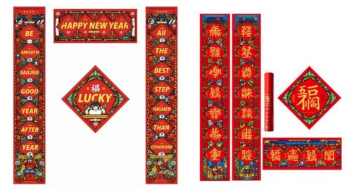 英文春联、合体字春联也是新花样。妙手回潮的这款英文春联,上联Be smooth sailing good year after year(一帆风顺年年好),下联All the best step higher than otherone(万事如意步步高),横批Happy new year,喜欢尝鲜的年轻人,还有海外同胞们和在中国过年的外国友人们会倍感亲切。同样是妙手回潮出品的财神大礼包,里面就有合体字春联,“年年有余”合体组成一个字,“四季安康”合体组成一个字,然后上联、下联各七个字,横批四个字。虽然不知道怎么念,但那股热闹和喜庆挡都挡不住,装饰效果十分不错。