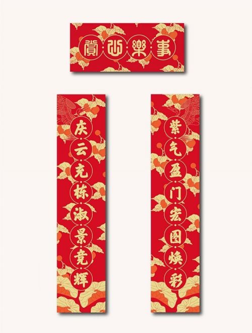 紫气盈门宏图焕彩,庆云充栋淑景竞辉——这是中国国家博物馆旗舰店出品的瑞彩平安年货礼盒中的春联。春联灵感来自“紫气东来”和“汗牛充栋”两个典故,横批上的“赏心乐事”是篆书,取自国博馆藏白玉赏心乐事文带扣,古拙又大气。在古代,带扣是一种小巧的日常用品,多用于装点衣着,彰显品位。将这枚带扣上的文字放大作为横批,自家门楣别有一番清雅之气。