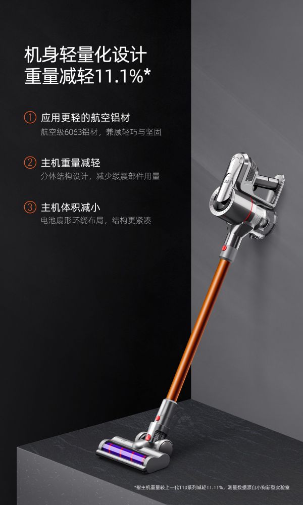 小狗吸尘器T11 Pro在保证性能的前提下,对机器内部结构进行了优化设计:首先,在机身材料选用方面采用了密度小、强度高的航空级6063铝材,既能保证机身坚固,又能减轻机身重量;其次,通过分体式结构进行了部件用量的优化,减轻主机重量,进而减轻机器整机重量;第三,电池采用扇形环绕布局,进一步减小整体体积,主机净重控制在1.48kg。以上三点让T11 Pro拥有了轻盈身材,操作起来更加省力,再加上该款产品140AW的大吸力、99.8%的整机过滤及72dB轻音运行,让这款产品备受用户喜爱。另外,这款产品标准档能实现50分钟的长续航,轻松满足大户型房屋的全屋清洁需求,清洁不费力,体验更舒心。