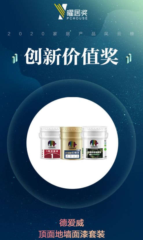 据了解,本次曜居奖评选依旧严苛,20多种品类,50多个品牌。100多款产品,经过了四个季度的层层入围评选和万人票选,最终诞生了五项大奖。而德爱威去年新近上市的顶面地墙面漆套装,最终拿到了其中的“创新价值奖”。