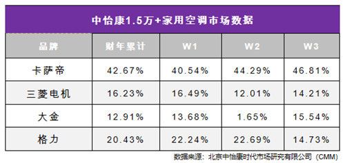 具体来看,前三周,在1.5万+家用空调市场,卡萨帝空调高端份额分别为40.54%、44.29%、46.81%;三菱电机份额为16.49%、12.01%、14.21%;大金份额别为13.68%、1.65%、15.54%;格力份额为22.24%、22.69%、14.73%。可以看到,在行业整体下行的大背景下,各大高端品牌市场表现也有所波动,其中卡萨帝呈上行态势。